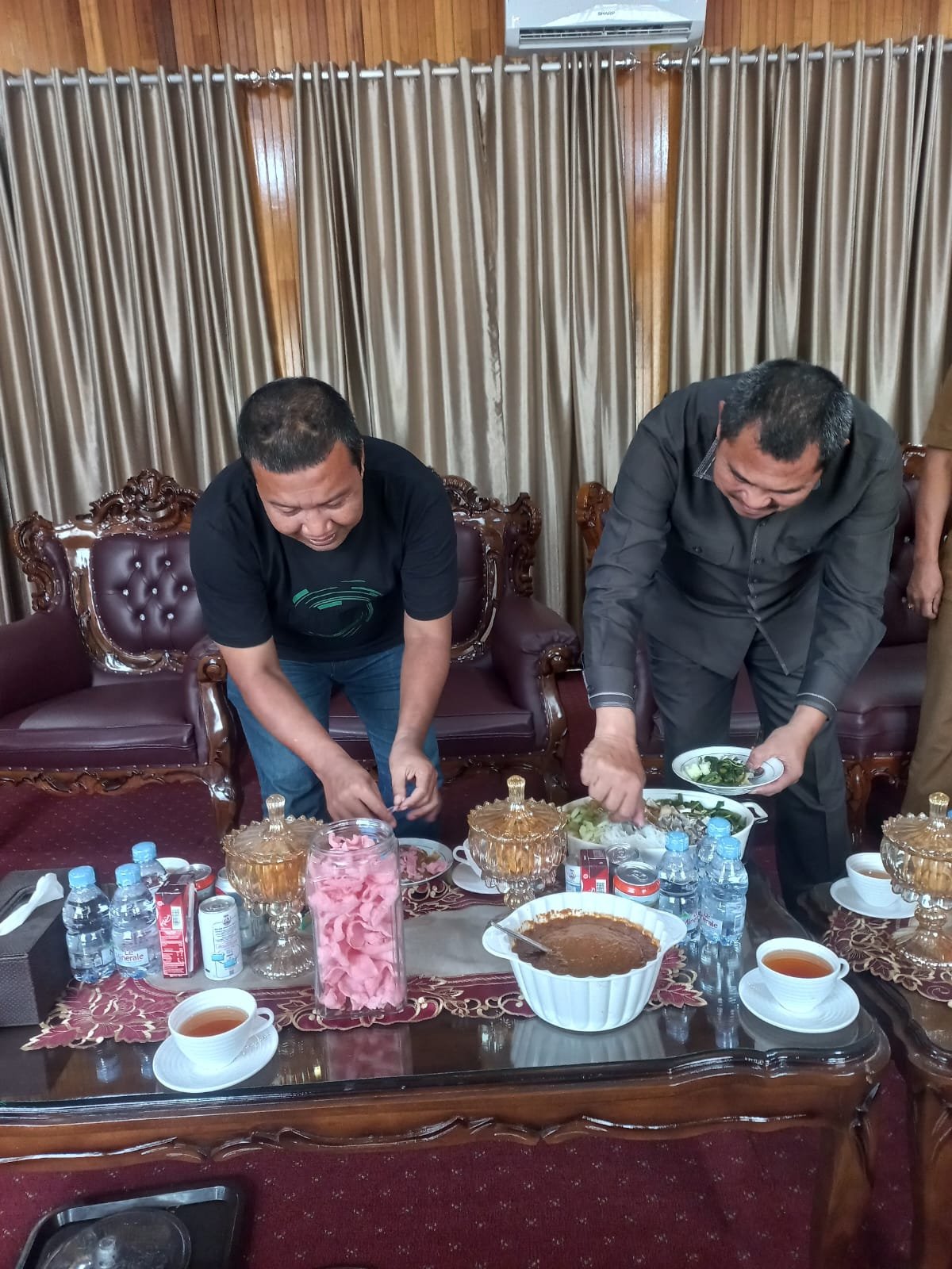 Muara bungo – Dua tokoh sentral provinsi Jambi kembali bertemu, Romi Hariyanto yang notabene Bupati Tanjabtim datang menyambangi kediaman H. Mashuri, SP, ME Bupati Bungo yang juga sebagai ketua DPD partai Demokrat Jambi. Kehadiran Romi disambut dengan hidangan makan pical bersama oleh H. Mashuri, disela-selanya kedua sahabat itu bersenda gurau berbincang lepas.