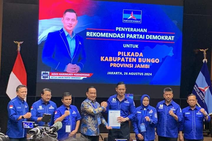 Muara Bungo – Pasangan Jumiwan Aguza – Maidani (JADI) akhirnya menambah enegri positif dalam mengarungi perhelatan pilkada Bungo dengan mendapatkan dukungan dari Partai Demokrat. Hal ini dipastikan, setelah pasangan muda ini menerima rekomendasi dukungan partai demokrat yang diserahkan langsung oleh AHY tadi sore. “Alhamdulillah kita kembali mendapat kepercayaan dari partai demokrat, partai besar pemenang kedua dikabupaten Bungo, semoga ini menjadi energi baru bagi kita dalam mengarungi Pesta demokrasi Bungo”, ungkap Jumiwan sumringah. Namun pria yang biasa dipanggil Jon zaki ini menegaskan, dukungan parpol merupakan modal utama, dan perjuangan sesungguhnya adalah mendapat tempat dihati masyarakat Bungo. “Mari bersama berjuang dan bergerak untuk meraih simpati masyarakat, agar kita menjadi pemenang pada pilkada nanti” tandasnya. Sementara ketua DPD Demokrat Jambi H. Mashuri, SP, ME mengatakan, pasca rekomendasi yang telah dikeluarkan oleh partai berlambang mercy itu, seraya mengintruksikan kepada seluruh kader agar patuh dan taat untuk bersama berjuang memenangkan pasangan JADI. “Sesuai arahan ketum AHY, seluruh pengurus, kader dan simpatisan demokrat harus bergerak bersama untuk berjuang memenangkan pasangan JADI ini, jika ada yang membelot, maka sanksi partai amat lah tegas”, ujar Hamas yang didampingi ketua DPC Demokrat Bungo H. Pardinan. Selaras dengan Hamas, ketua DPC Demokrat Bungo H. Pardinan mengatakan, perintah partai dalam hal dukungan ini, menjadi tolok ukur komitmen kader. “Saya mengintruksikan khususnya anggota DPRD dari partai demokrat kembali lagi turun ke basis untuk memperjuangkan kandidat kita, agar kita bisa memastikan kemenangan dalam pilkada Bungo ini”, kata anggota DPRD terpilih itu tegas. (***)