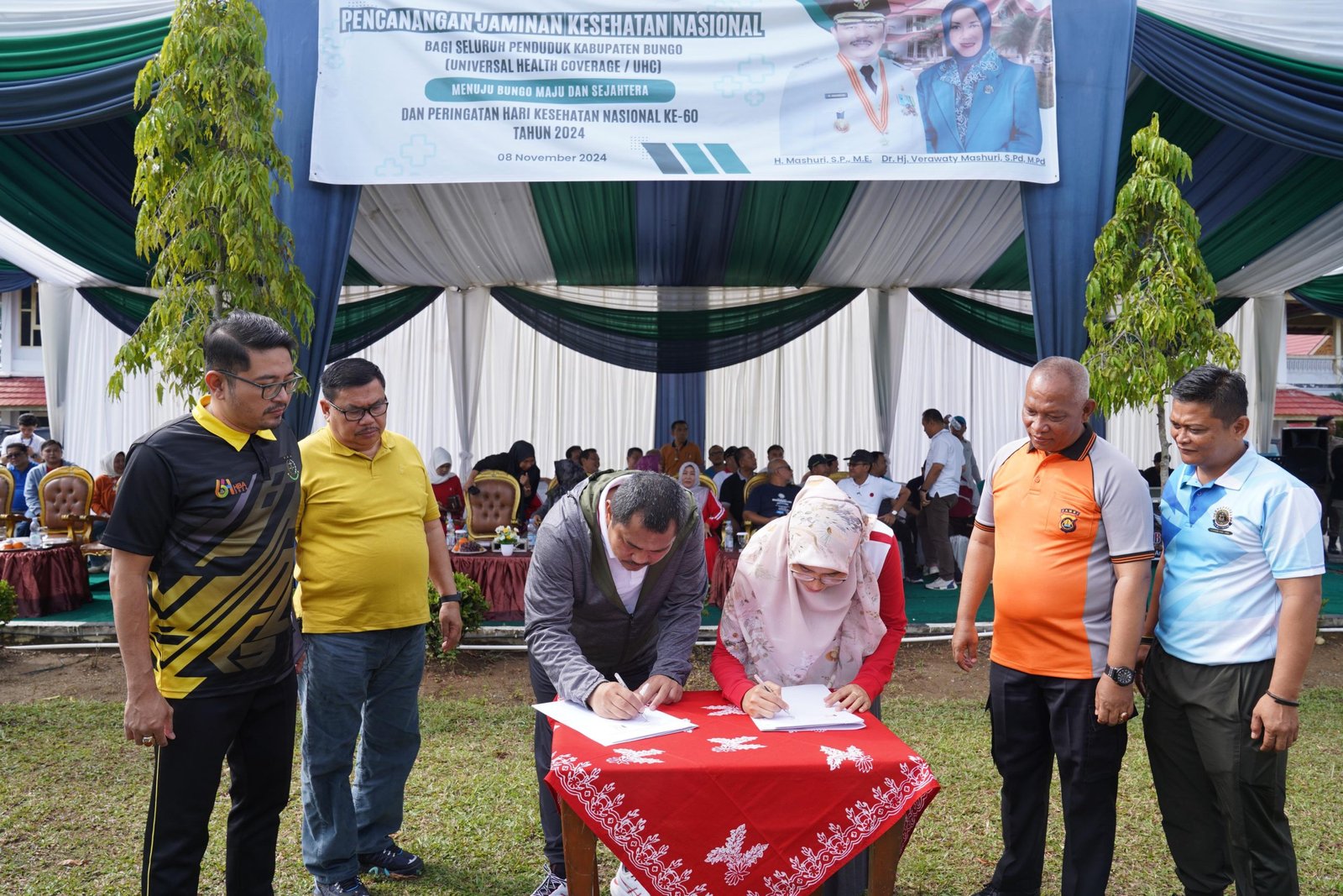 Bupati Bungo H.Mashuri Menandatangani nota Kesepakatan antara Pemerintah Kabupaten Bungo dan BPJS Kesehatan tentang Optimalisasi Program Jaminan kesehatan serta mencanangkan Jaminan kesehatan Nasional Bagi seluruh penduduk Kabupaten Bungo, Jum’at (08/11/2024).